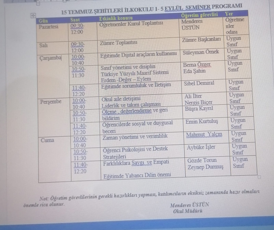 15 Temmuz Şehitleri İlkokulu öğretmenlerimizin katılımıyla gerçekleşecek olan 1-5 Eylül 2025 Seminer Programı, eğitim faaliyetlerimizin verimli bir şekilde başlaması için planlanmıştır.