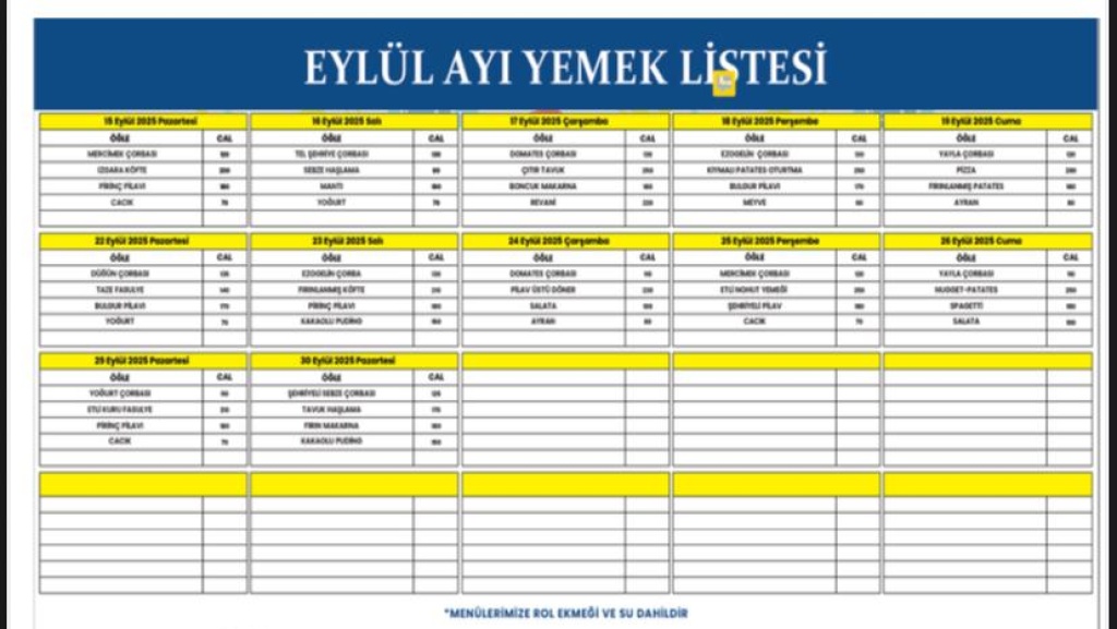 Okulumuzun 2025-2026 eğitim öğretim yılı Eylül ayı yemek listesi yayınlandı. Öğrencilerimizin sağlıklı ve dengeli beslenmesini desteklemek amacıyla hazırlanan listede, besin değerleri gözetilerek çeşitli menüler yer aldı.